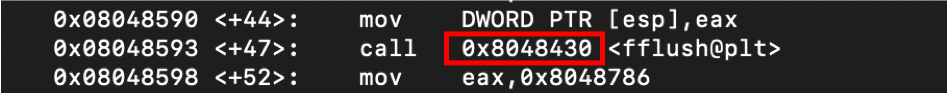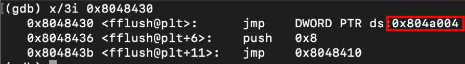 PLT가 참조하는 부분이니까 결국 fflush의 GOT는 0x804a004임을 알 수 있다.