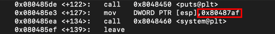 따라서 system("/bin/sh")의 시작 주소는 0x080485e3임을 알 수 있다.