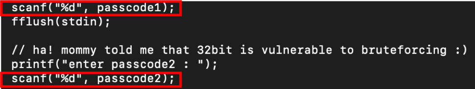 코드를 보면 passcode1, passcode2를 입력받는 부분이 있는데, 자세히 보면 &passcode가 아니고 &가 빠져있는 것을 볼 수 있다. 이는 passcode1, passcode2 변수에다가 우리가 입력한 값을 저장하겠다는 의미가 아니라 passcode1, passcode2가 있는 주소에다가 우리가 입력한 값을 넣겠다는 의미이다. 그래서 쓰레기값이 있는 주소에 우리가 입력한 값을 넣어 오류가 뜨게 된다.