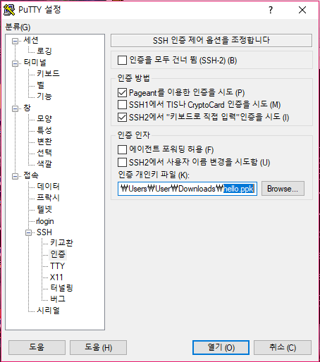 3) 같은 창의 왼쪽에 [SSH-인증] 에 들어가 '인증 개인키 파일'에서 [Browse]를 누르고 아까 변환한 .ppk파일을 선택한다. 그리고 열기를 누르면 정상적으로 ubuntu에 접속이 된다.