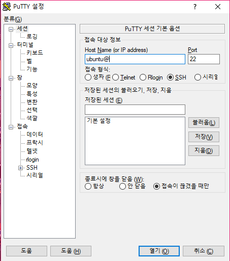 2) Host Name에는 [user_name@public_DNS]를 입력한다. 난 ubuntu를 설치했으므로 user_name은 ubuntu이다. (아래의 문서 링크 참조) 그리고 포트가 22번인지 확인해준다.