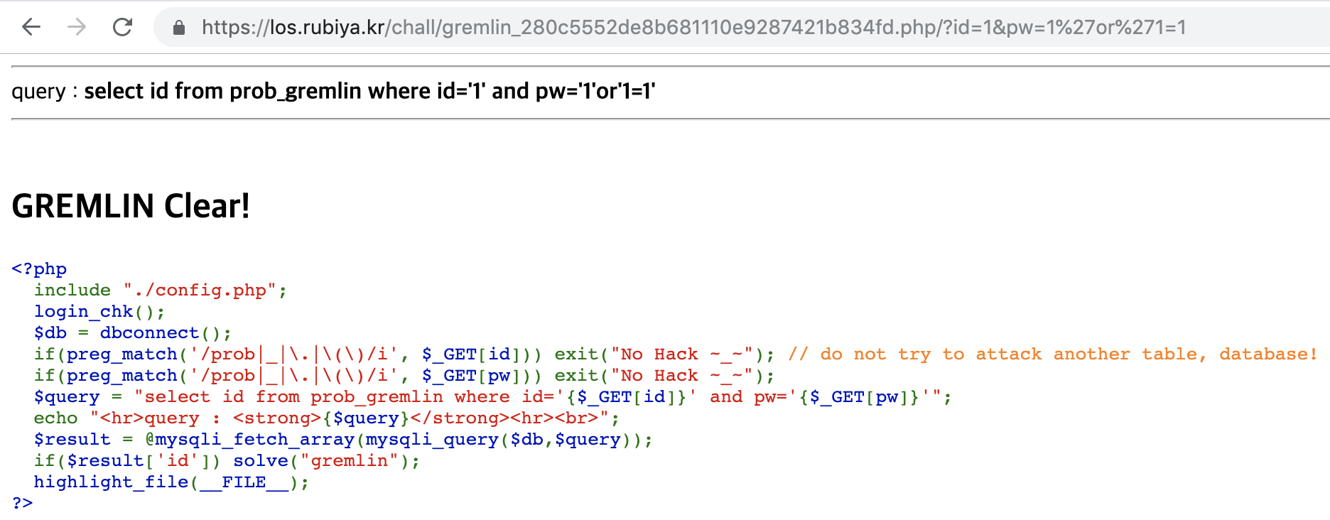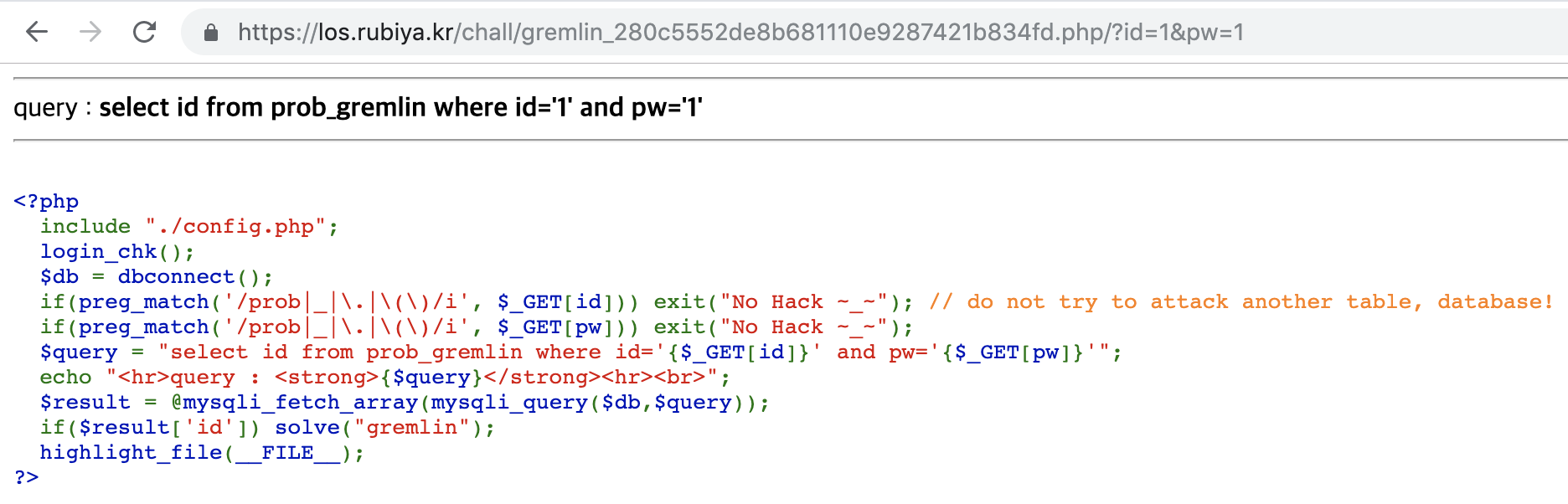 코드에서 쿼리문을 보니 id와 pw를 get방식으로 입력받는것을 알 수 있었고, url뒤에 ?id=1&pw=1을 입력해보니 아래처럼 쿼리문이 바뀌어있는것을 확인하였고, 이를 조작한다면 문제가 풀릴것이라는 것을 알 수 있었다.