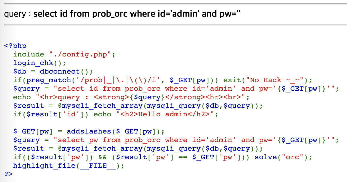 문제 풀이 처음에 문제를 보고 org문제와 비슷하다는 생각을 했다. org문제처럼 비밀번호를 직접 알아내야 문제가 풀리는 구조였기 때문이다. org에서는 직접 값들을 일일이 입력해보는 방식으로 문제를 풀었는데 이번에는 파이썬으로 비밀번호를 알아낼 수 있게 코드를 작성해보기로 했다. * 알고리즘 및 코드 설명 org문제와 마찬가지로 코드를 보면 어떤 값이 참이 될 때 Hello admin이 나오는 것을 확인할 수 있다. 그래서 그때와 마찬가지로 우리가 특정 값을 url로 넣었을 때 Hello admin이라는 글자가 페이지에 나온다면 그 조건을 만족하는 것이므로 비밀번호를 유추할 수 있다. 이 성질을 이용해 우리가 넣은 조건이 참인지 거짓인지 판단한다. 우선 length함수를 통해 비밀번호의 길이를 알아내고..