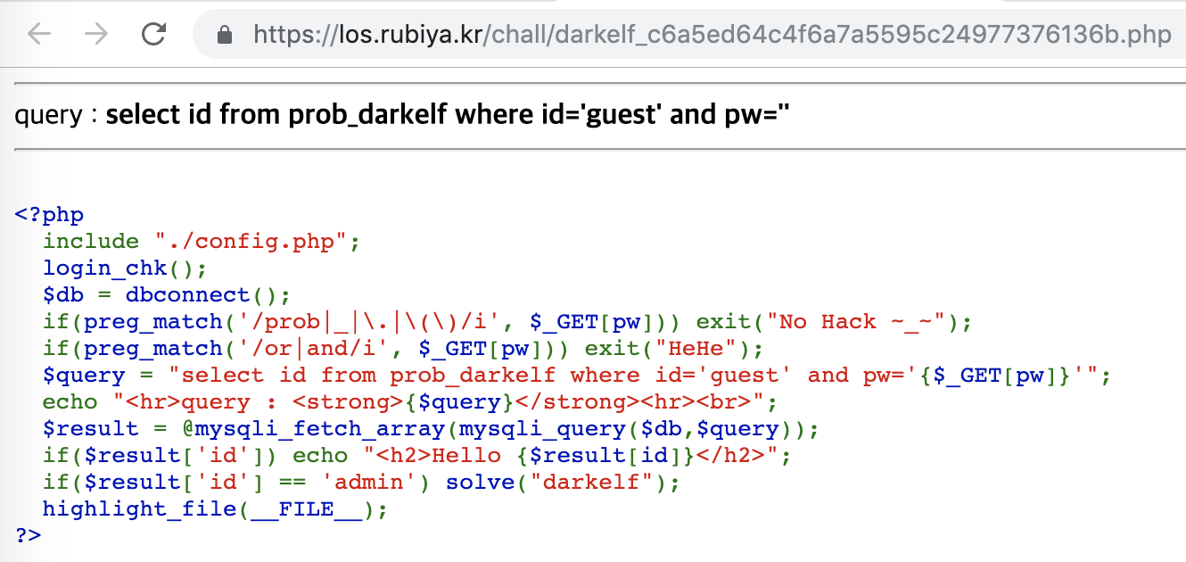 문제 풀이 처음에 문제를 보고 org문제와 비슷하다는 생각을 했다. org문제처럼 비밀번호를 직접 알아내야 문제가 풀리는 구조였기 때문이다. org에서는 직접 값들을 일일이 입력해보는 방식으로 문제를 풀었는데 이번에는 파이썬으로 비밀번호를 알아낼 수 있게 코드를 작성해보기로 했다. * 알고리즘 및 코드 설명 org문제와 마찬가지로 코드를 보면 어떤 값이 참이 될 때 Hello admin이 나오는 것을 확인할 수 있다. 그래서 그때와 마찬가지로 우리가 특정 값을 url로 넣었을 때 Hello admin이라는 글자가 페이지에 나온다면 그 조건을 만족하는 것이므로 비밀번호를 유추할 수 있다. 이 성질을 이용해 우리가 넣은 조건이 참인지 거짓인지 판단한다. 우선 length함수를 통해 비밀번호의 길이를 알아내고..
